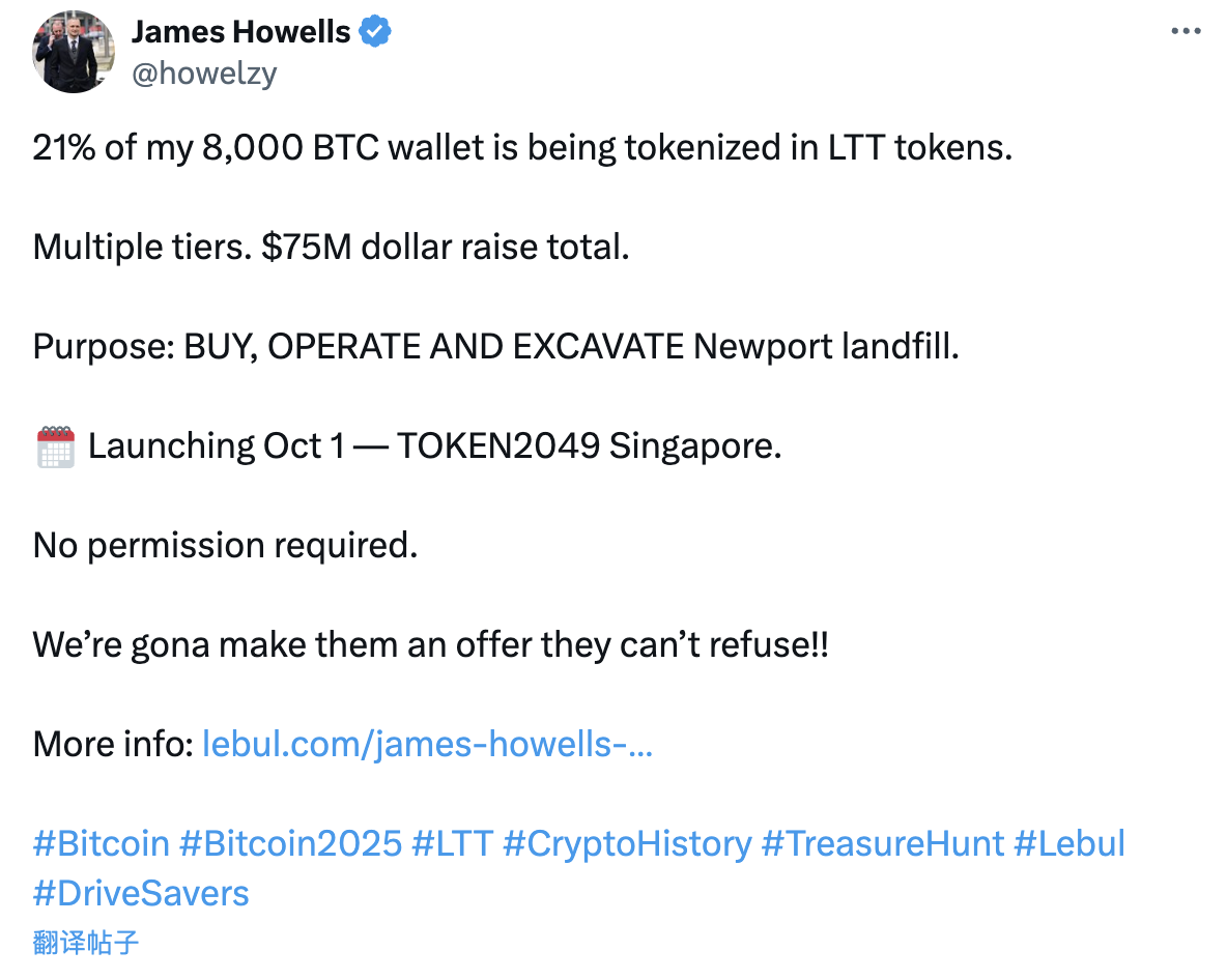 ハウエルズ氏は今年5月、個人アカウントXで、8,000BTCの21%をトークン化し、10月1日にシンガポールで開催されるTOKEN 2049でローンチし、7,500万ドルを調達する計画を明らかにしていた。しかし、その後数ヶ月、ハウエルズ氏は個人のソーシャルメディアチャンネルでこの件について言及しておらず、計画は頓挫したようだ。BTCが回収不可能な可能性が高いことは誰もが知っており、7,500万ドルを調達しようとするのは少々恥ずかしい。