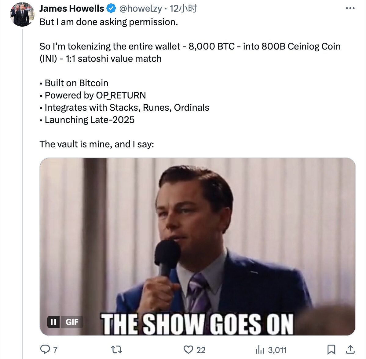 今朝、ハウエルズ氏はBTCの新たなトークン化計画を発表し、8,000億セニオグコイン(INI)の発行を計画しています。年末のローンチを目指し、このトークンはビットコインネットワーク上に構築され、OP_RETURNを搭載し、スタック、ルーン、オーディナルと統合されます。各INIはBTCの1サトシの価値にペッグされます。