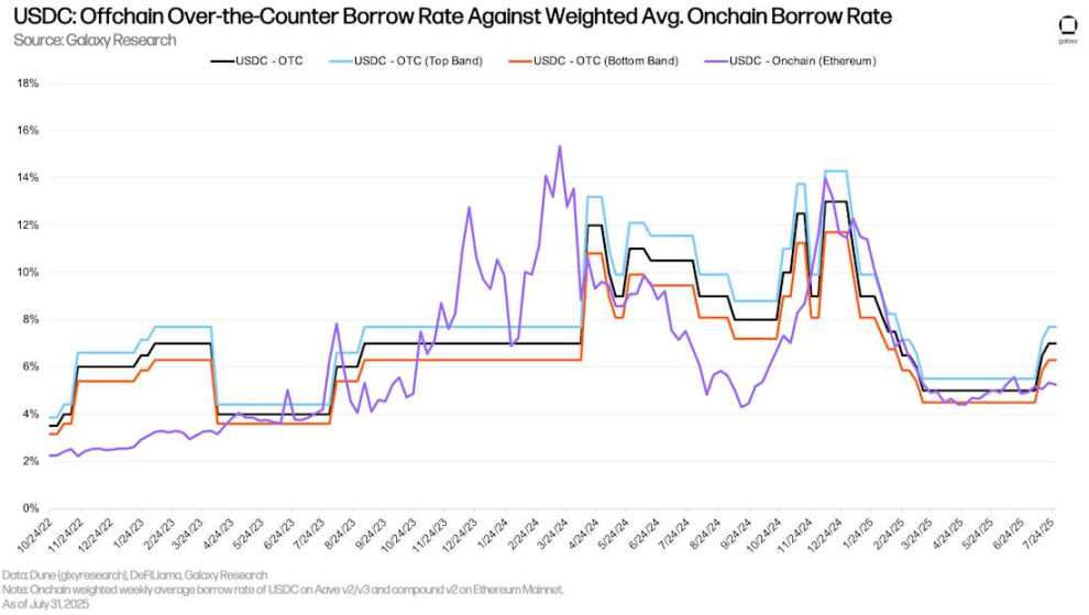 下のチャートはUSDTの同じ金利を示しています。7月初旬以降、USDTのオンチェーン金利とOTC金利はUSDCよりも接近しています。