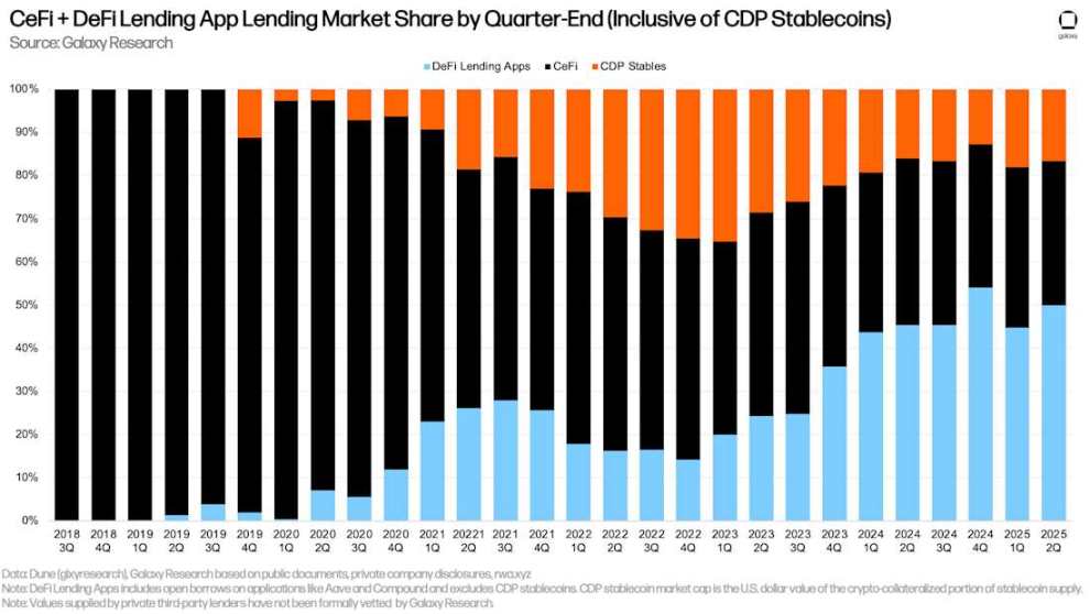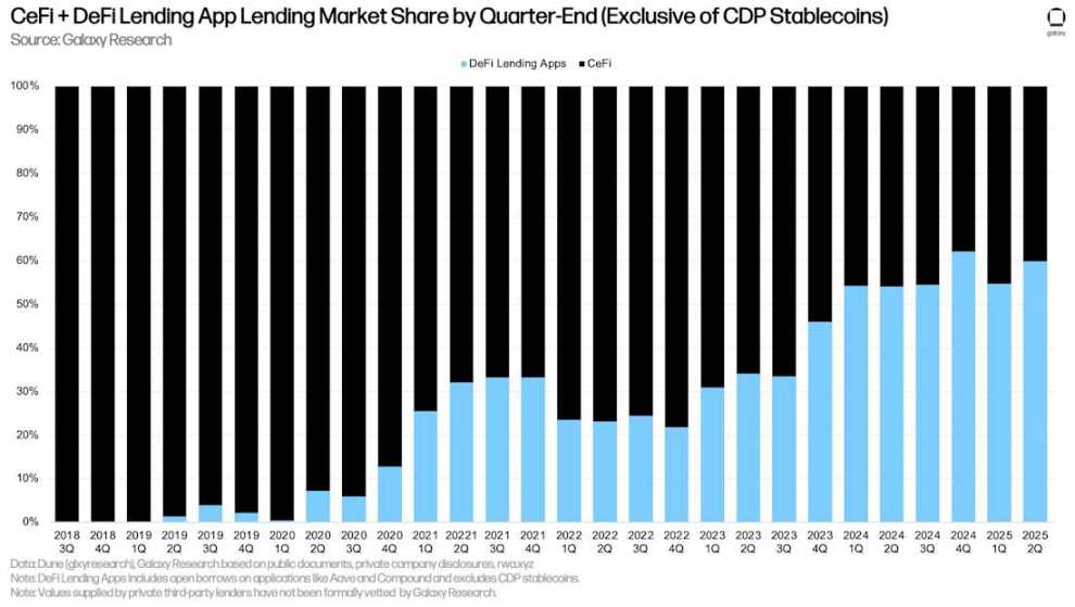 DeFiレンディングアプリケーションにおける未払い借入額の四半期ごとの増加により、DeFiレンディングアプリケーションがCeFiレンディングプラットフォームに対してリードする状況は、2024年第4四半期に再び過去最高に近づいています。2025年第2四半期末の時点で、DeFiレンディングアプリケーションはCeFiレンディングプラットフォームの59.83%を占めており、2025年第1四半期の54.56%から増加しましたが、2024年第4四半期の最高値61.99%からは216ベーシスポイント減少しました。