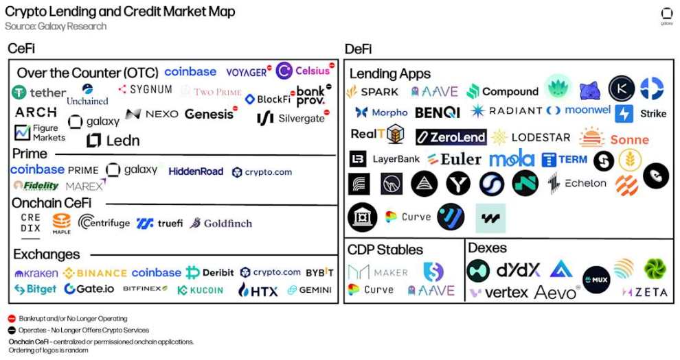 以下は、CeFiおよびDeFi暗号資産レンディング市場における主要プレーヤーを示しています。暗号資産価格の急落と流動性の枯渇により、融資規模で最大規模のCeFiレンディング機関の一部は2022年と2023年に破綻しました。これらのレンディング機関は赤い警告点で強調表示されています。Galaxyの前回の暗号資産レバレッジレポート以降、5つのDeFiアプリケーション、1つのCeFiレンディング機関、そして1つの担保付き債務ポジション(CDP)ステーブルコインを追加しました。