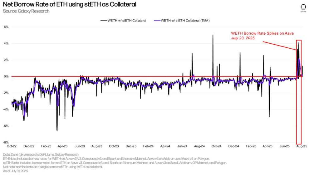 Liquid Staking Tokens (LST) または Liquid Restaking Tokens (LRT) を担保 (これらの利回り生成トークン) として使用することで、ユーザーは低い (またはマイナスの) 純借入金利で ETH ローンを取得できます。このコスト効率の良さから、リサイクル戦略が採用されています。つまり、ユーザーは LST を担保として繰り返し使用し、ステークされていない ETH を借り入れ、それをステークし、生成された LST を使用してさらに ETH を借り入れることで、ETH ステーキングの年間金利へのエクスポージャーを拡大します。この戦略は、ETH の借入コストが stETH ステーキングの年間金利よりも低い場合にのみ機能します。ほとんどの場合、ユーザーはこの戦略を正常に実行できます。しかし、7 月 15 日から 7 月 25 日の間に、Aave V3 Core から 300,000 ETH 近くが引き出され、ETH 借入金利が急上昇し、リサイクル戦略が採算が取れなくなりました (下の図では、純金利が常に 0% を上回っています)。