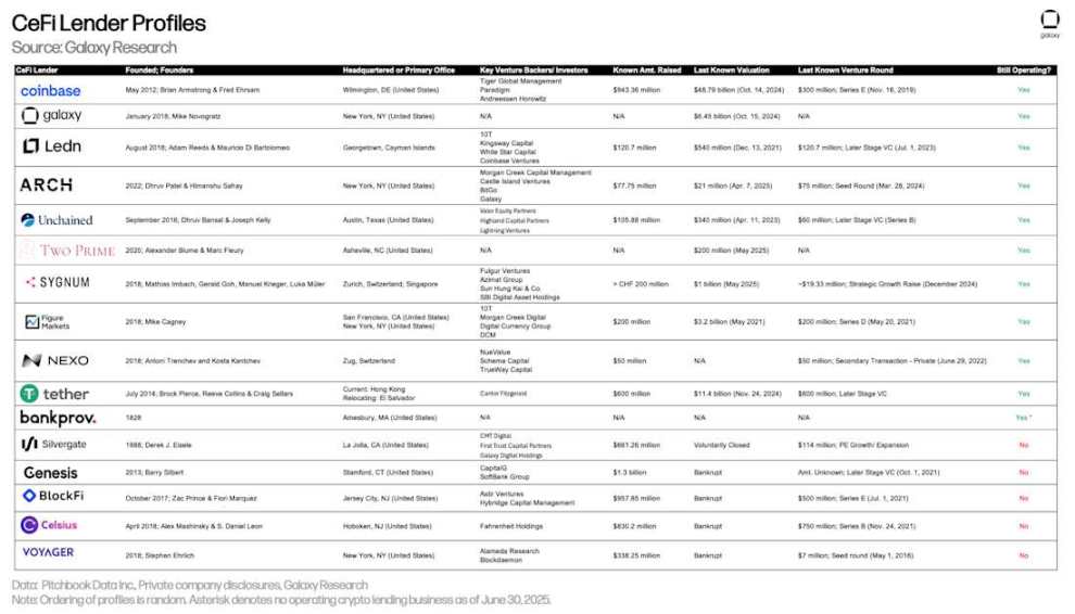 以下の表は、市場分析に含まれるCeFi暗号資産貸付業者を比較したものです。一部の企業は投資家に複数のサービスを提供しています。例えば、Coinbaseは主に取引所として運営されていますが、店頭取引による暗号資産ローンや信用取引を通じて投資家に融資を提供しています。ただし、本分析では暗号資産担保貸付の規模のみに焦点を当てています。