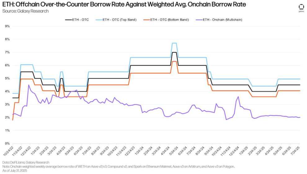 ビットコインと同様に、オンチェーンレンディングアプリケーションを通じたETHの借入コストは、店頭(OTC)での借入コストよりも大幅に低くなります。これは主に2つの要因によるものです。1) BTCと同様に、OTC市場には空売り需要がありますが、オンチェーンではそれほど一般的ではありません。2) イーサリアムの年間ステーキングレート(APR)は、OTC借入の下限金利となります。これは、供給者がAPRよりも低い金利でOTCプラットフォームに資産を預け入れたり、OTCプラットフォームがAPRよりも低い金利で資産を貸し出したりするインセンティブがほとんどないためです。したがって、ETHの場合、OTC借入の下限金利は通常APRであり、オンチェーンAPRは通常上限金利となります。