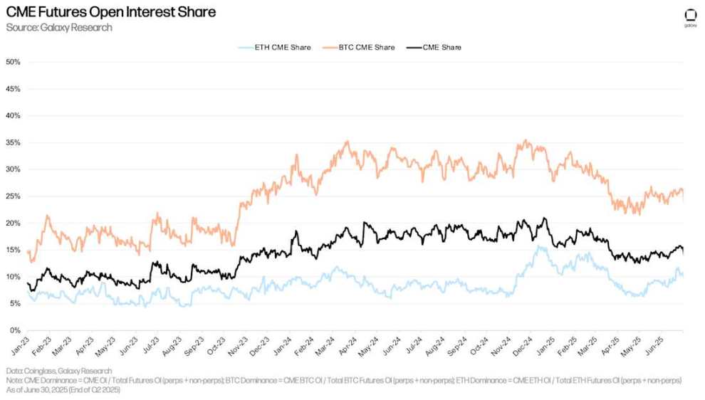 6月30日現在、CMEのイーサリアムの未決済建玉(CMEイーサリアムの未決済建玉を市場全体の未決済建玉で割って算出)は10.77%で、2025年第1四半期末から218ベーシスポイント上昇し、2025年1月1日から118ベーシスポイント下落した。同様に、CMEのビットコインの未決済建玉は第2四半期に380ベーシスポイント上昇して26.32%となり、年初から152ベーシスポイント下落した。