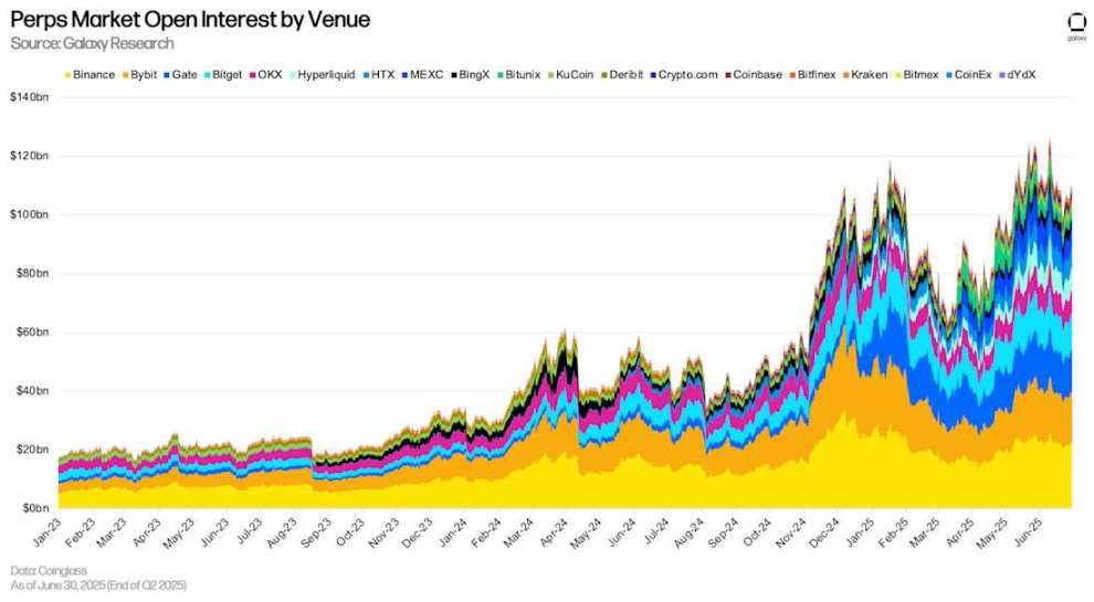 Binanceは永久先物市場で最大のシェアを占め、未決済建玉の20.83%を占めています。これにBybit(15.41%)、Gate(12.85%)が続きます。第2四半期末時点で、Hyperliquidの未決済建玉は75億1600万ドルで、永久先物市場全体の6.91%を占めています。