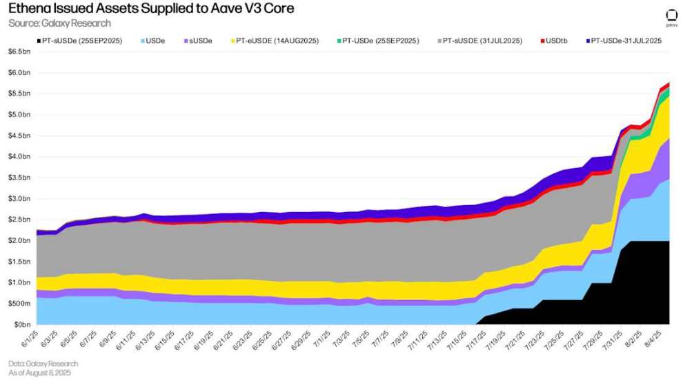 8月8日現在、Aave V3 Core上のEthena資産は57億9000万ドル相当の未決済で、そのうち55.88%はPendle PTトークンでした。さらに、USDe(Ethena上の合成USD)とsUSDe(ステーキングされたUSDe。そのリターンはUSDeの裏付けとなる担保から得られる)の合計は24億5000万ドルでした。