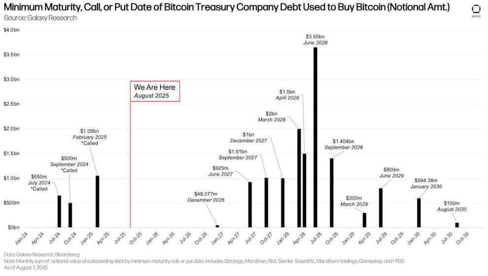 ビットコインDATCOは新たな債務を発行していないため、データ準備金を追跡する企業の未払い債務残高は変化していません。しかしながら、2028年6月には36億5000万ドルの未払い債務が満期を迎えるため、依然として注目すべき月です。
