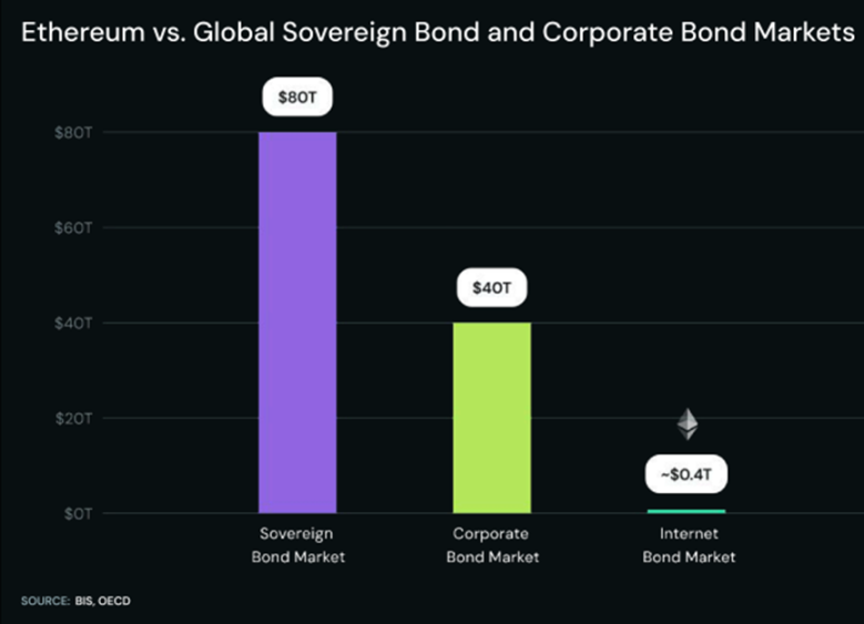ステーキングによってネイティブプロトコルのリターンが生み出されるため、ETHは世界初の「インターネット債券」となりました。歴史的に、企業の財務担当者は資金を国債(約80兆ドル相当)と社債(約40兆ドル相当)に配分するのが一般的でした。ETHステーキングは、発行、リスク、リターンのプロファイルを幅広く理解できる新しい債券カテゴリーを生み出しました。現在、この市場は国債市場や社債市場よりも桁違いに小さいですが、社債や国債とは異なり、ETHには満期日がなく、リターンは永続的に生み出されます。リターンはプロトコルによって生み出されるため、ETHステーキングはカウンターパーティリスクを排除し、債券発行者にデフォルトリスクを負わせません。