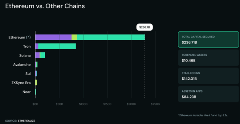 純粋な決済担保。発行体リスクや管轄リスクを負うトークン化資産を基盤として新たな経済が構築され続ける中、金融システムには信頼性が高く、中立的で、非国家主体の担保資産が必要です。この資産こそがETHです。BTCに加え、ETHはオンチェーン経済において、外部のカウンターパーティリスクから完全に保護できる唯一の「純粋な」担保資産です。イーサリアムの2,370億ドルの担保価値は、ETHを次世代金融システムの礎石としており、検閲耐性も備えています。