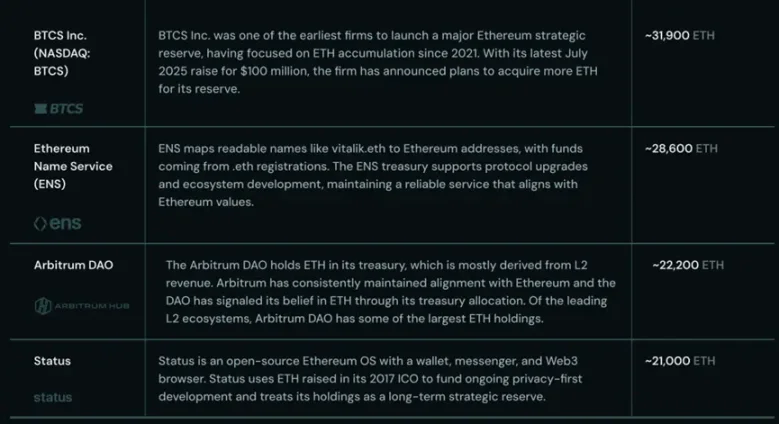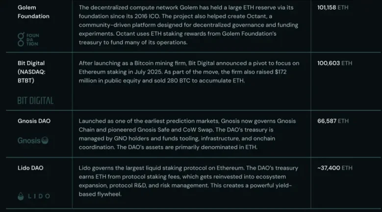 多くの上場企業やイーサリアムネイティブ組織がETHの財務管理戦略を導入しています。ほとんどの戦略は収益を生み出すことを目的としていますが、ETHを長期運用の基軸通貨と見なす組織もあります。多くの組織は、その両方を採用しています。