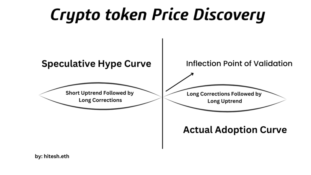 どれほど誇大宣伝に満ちていようとも、すべての暗号トークンは同じ価格発見サイクルを辿ります。それは「0-1フェーズ」から始まります。誇大宣伝が優勢で、実際の普及率はほぼゼロです。価格は感情だけで高騰し、架空の「未来ビジョン」を中心にコミュニティが形成され、誇大宣伝が現実を覆い隠します。そして、必然的に激しい調整局面が訪れます。それは、不安定な保有者を排除し、盲目的に約束に飛びついた者たちを暴き出すのです。