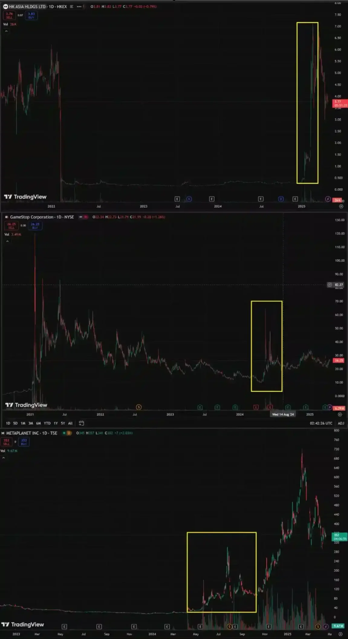 2021年の「個人投資家戦争」で有名になった小売業者ゲームストップは、2025年3月27日にビットコインを購入するために13億ドルの無利子転換社債を発行すると発表したが、それ以前の関連する噂により、市場前取引で株価が18%以上上昇した。日本のメタプラネットもそれに劣らない。同社はマイクロストラテジーに倣い、2024年4月にビットコインを購入して以来、株価は約4,000%急騰しており、2025年には1万ビットコインに到達することを目標としている。