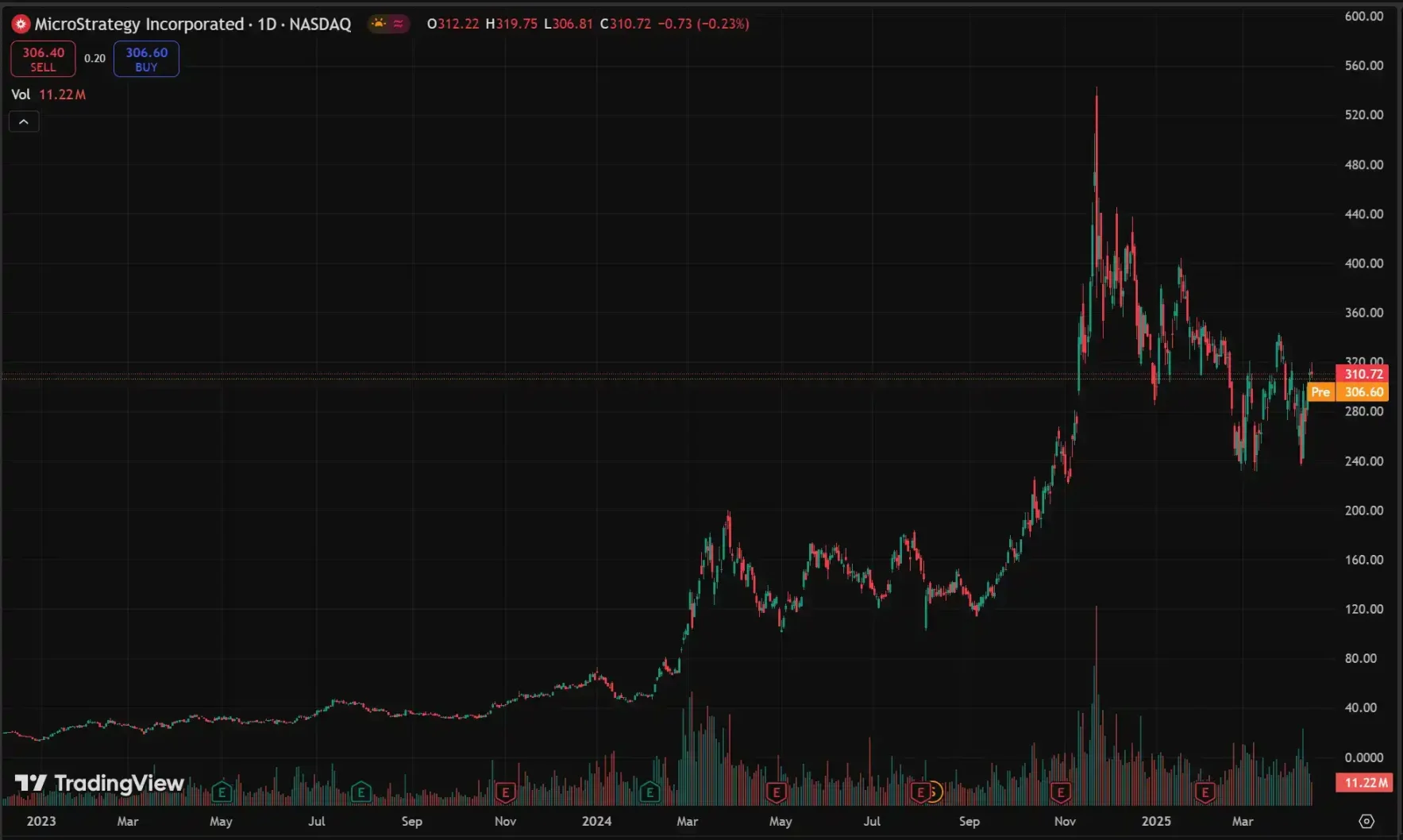 2024年、MSTRの株価は477%急騰し、米国株式市場において時価総額50億ドル以上のテクノロジー企業の中でAppLovinに次ぐ第2位となった。ビットコイン投資により同社は帳簿上の利益が最大131億4000万ドルに達し、時価総額は一時1000億ドルを超え、米国株式市場のスター企業となった。