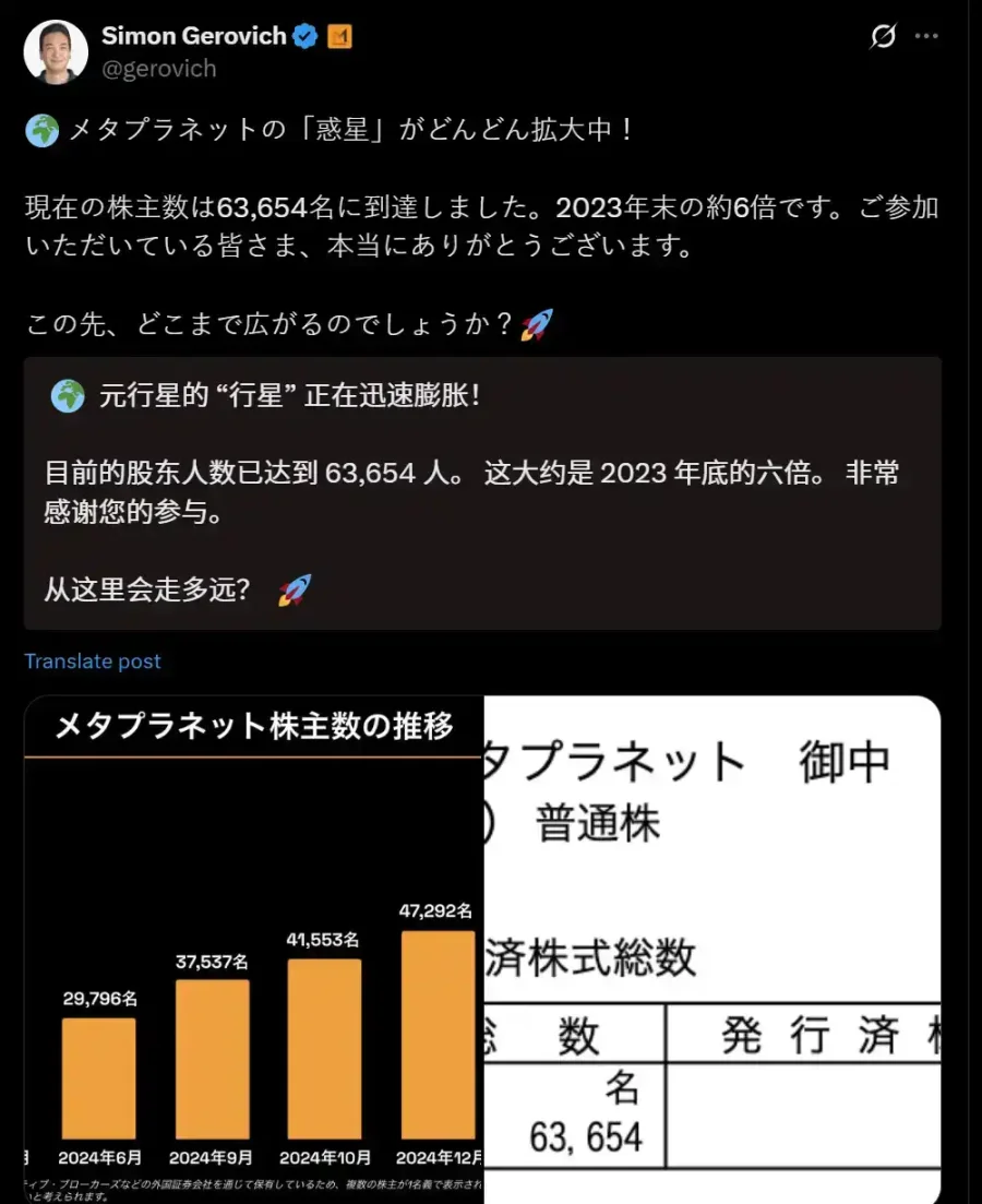 2024年4月、Sora Venturesの創設者であるジェイソン・ファン氏は自身のTwitterアカウントに「Metaplanetは「アジア初のマイクロストラテジー」であり、UTXO Management、マーク・ユスコ氏らとの協力を通じて、Metaplanetがビットコインをバランスシートに組み入れることを支援し、日本で初めてビットコインを公に保有する上場企業となった」と投稿した。