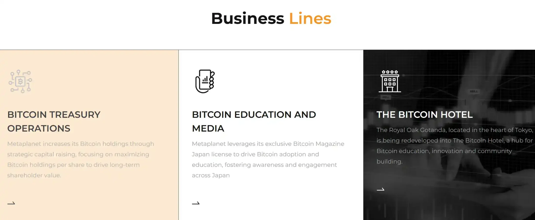 メタプラネットの事業範囲(BTC保有、BTC教育、BTCテーマホテル)、出典:メタプラネット