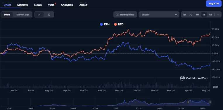 約1か月後の2025年1月1日、ビットコインの価格は94,500ドルとなり、前月よりわずかに上昇しましたが、イーサリアムはさらに下落して3,298ドルになりました。 2月1日までに、価格データによればビットコインは84,381ドルまで急落し、イーサリアムは2,236ドルまで下落した。ビットコインは同月後半に10万2000ドルに達したが、イーサリアムは以前の高値まで回復できなかった。実際、ビットコインは2月の84,381ドルから4月の94,304ドルまで上昇したが、イーサリアムは下落を続け、以前の高値を再テストすることができなかった。実際、チャートデータに示されているように、BTC/ETH比率は拡大しています。