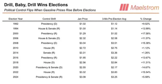 この戦略が正しいかどうかは、ウエスト・テキサス・インターミディエイト(WTI)とブレント原油市場の動向によって明らかになるだろう。名目GDPとドル建て信用供給の増加に伴い、原油価格は上昇するのか、それとも下落するのか?GDPと原油価格が同時に上昇すれば、民主党(青)陣営が勝利する。一方、GDPが上昇する一方で原油価格が横ばいまたは下落すれば、共和党(赤)陣営が勝利するだろう。