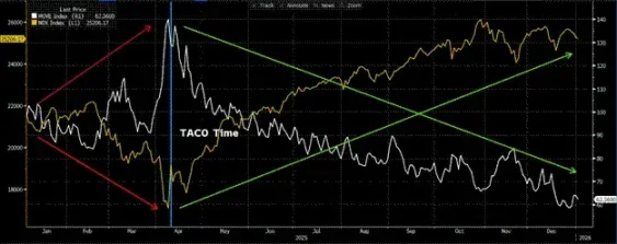 例えば、昨年4月2日の「解放記念日」と、それに続く4月9日のトランプ大統領の「TACO」(関税措置)が好例です。当時、トランプ大統領は極めて高い関税を課すと警告しました。これは世界貿易と金融フローの不均衡を縮小させ、強いデフレ効果をもたらすとされていました。市場は急落し、MOVE指数は日中に一時172まで急上昇しました。翌日、トランプ大統領は関税を「一時停止」すると、市場はその後底打ちし、その後急反発しました。