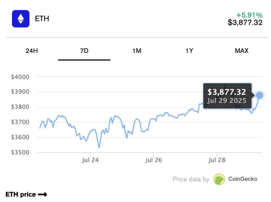 イーサリアムは月曜日の取引中に一時3,900ドルを超え、12月初旬以来の高値を付けた後、下落しました。過去1ヶ月間で50%以上急騰しており、この上昇はイーサリアム・トレジャリーの台頭、GENIUS法の成立に伴うイーサリアム・エコシステムの改善、そして市場におけるその潜在能力への認識と密接に関連しています。