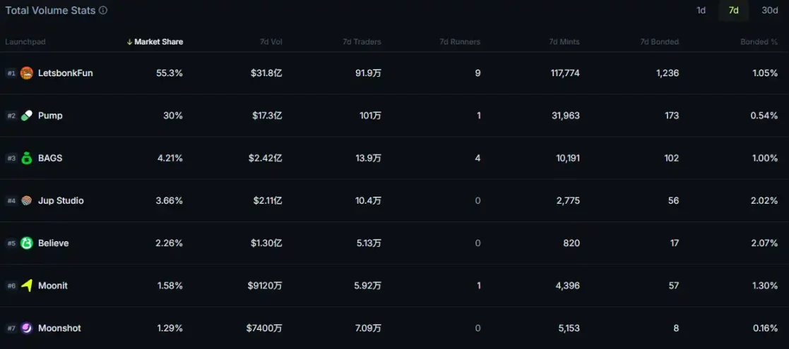 過去7日間、Letsbonk.funの市場シェアは50%を超え、トップの座を維持しています。pump.funの人気が再び高まったのは、主に新しいコインの好調なパフォーマンスによるものですが、広く議論を呼んだ新しいコインはそれほど多くありません。