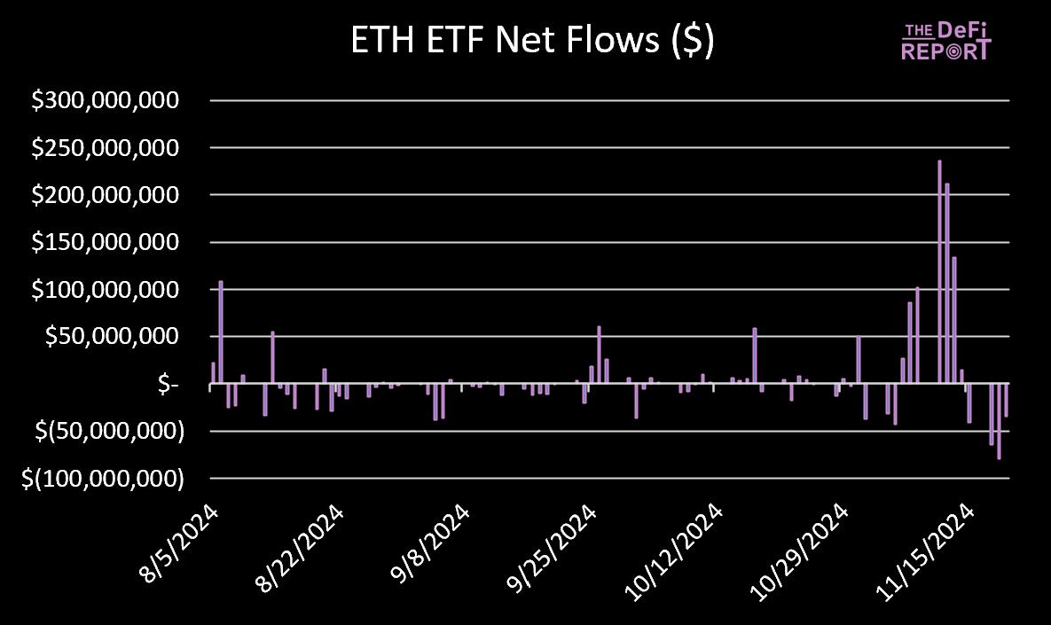 イーサリアムスポットETFは最近になってようやくある程度の流入が見られるようになったが、流入額はビットコインスポットETFに比べればほんの一部に過ぎない。 11月20日時点で、イーサリアムスポットETFの純流入額は4億6,900万米ドルで、ビットコインスポットETFの純流入額のわずか1.7%に過ぎず、当初予想していた資本回収率の10~20%を大きく下回りました。