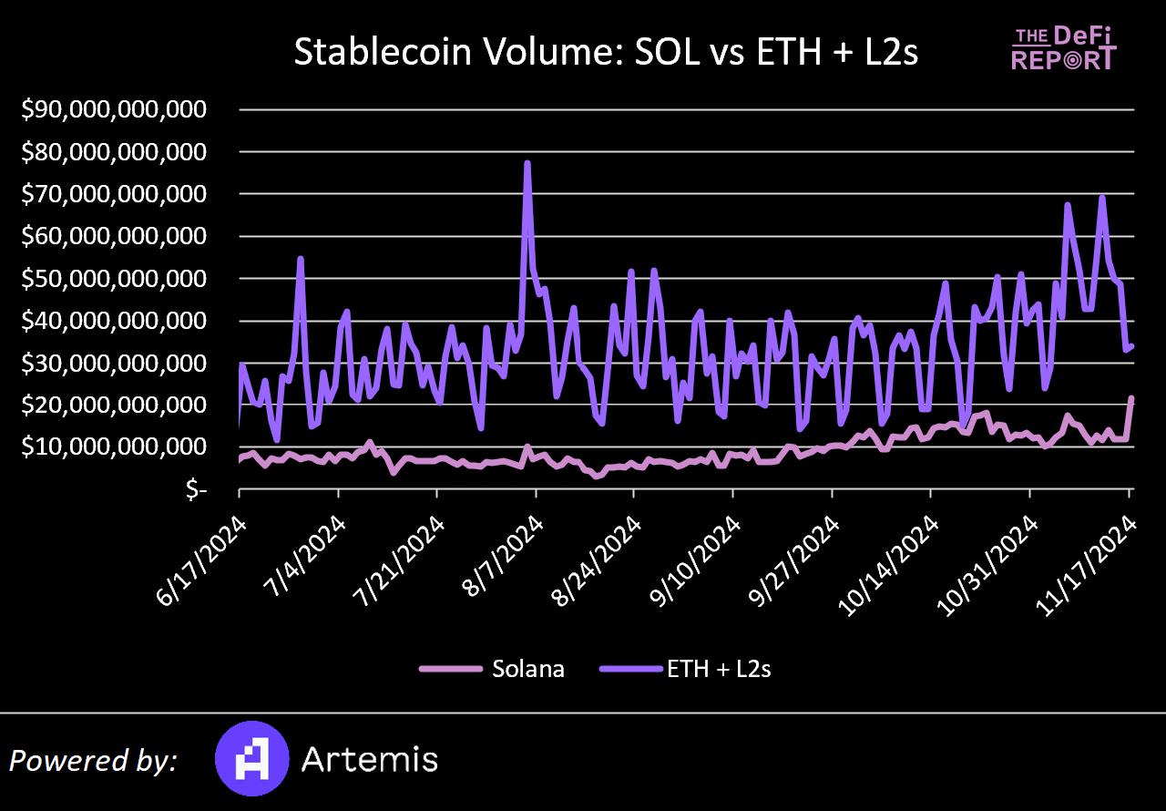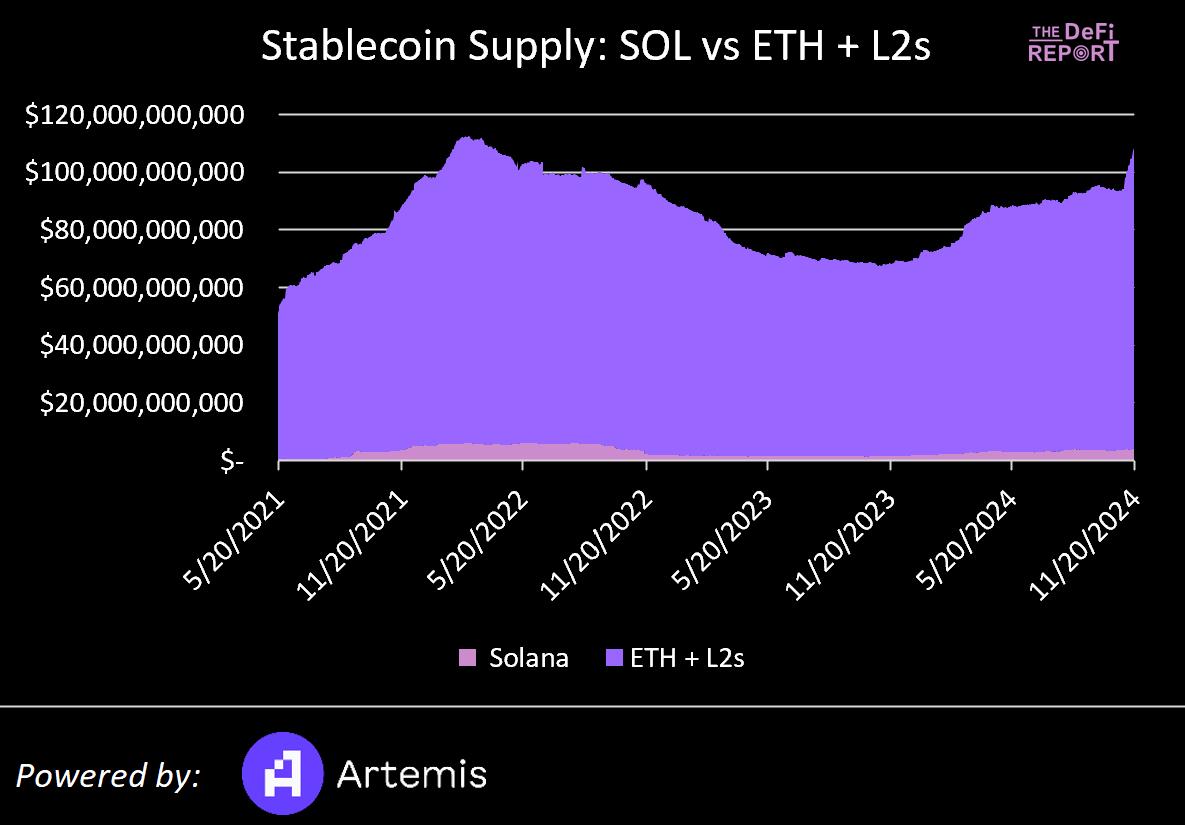 2024年7月時点で、Solanaのステーブルコイン供給量は約31億ドルで、イーサリアムとL2sステーブルコイン供給量の約3.5%を占めた。