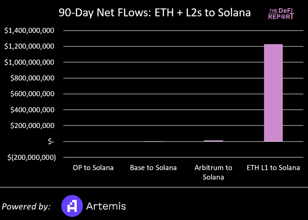 過去90日間で、ソラナはイーサリアムから12億ドル以上のTVLを集めており、これはイーサリアムのL1 TVLの約2%を占めています。同じ期間に、Arbitrum からさらに 1,400 万ドルの TVL を獲得しました。