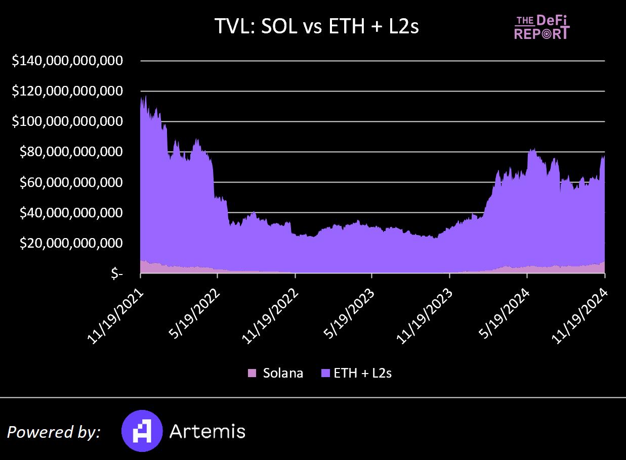 現在、Solana の TVL は 82 億ドルに上昇し、イーサリアムおよび上位 L2 の TVL の 12% を占めています。