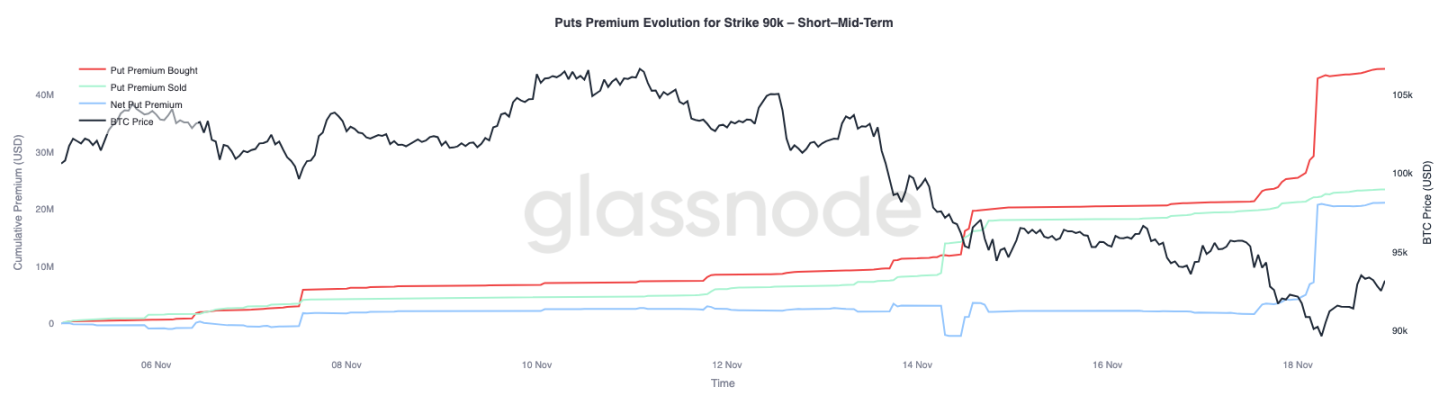 全体的な資金フローデータにさらに注目すると、権利行使価格9万ドルのプットオプションプレミアムは、価格下落に伴い保護的な需要が加速していることを示しています。過去2週間、この権利行使価格におけるプットオプションの純プレミアムは、ビットコインが9万3000ドルの水準を下回るまでは比較的均衡していました。このサポート水準を下回ると、トレーダーはこれらのプットオプションの価格を積極的に引き上げ始め、9万ドルの権利行使価格における買いプレミアムが大幅に上昇しました。