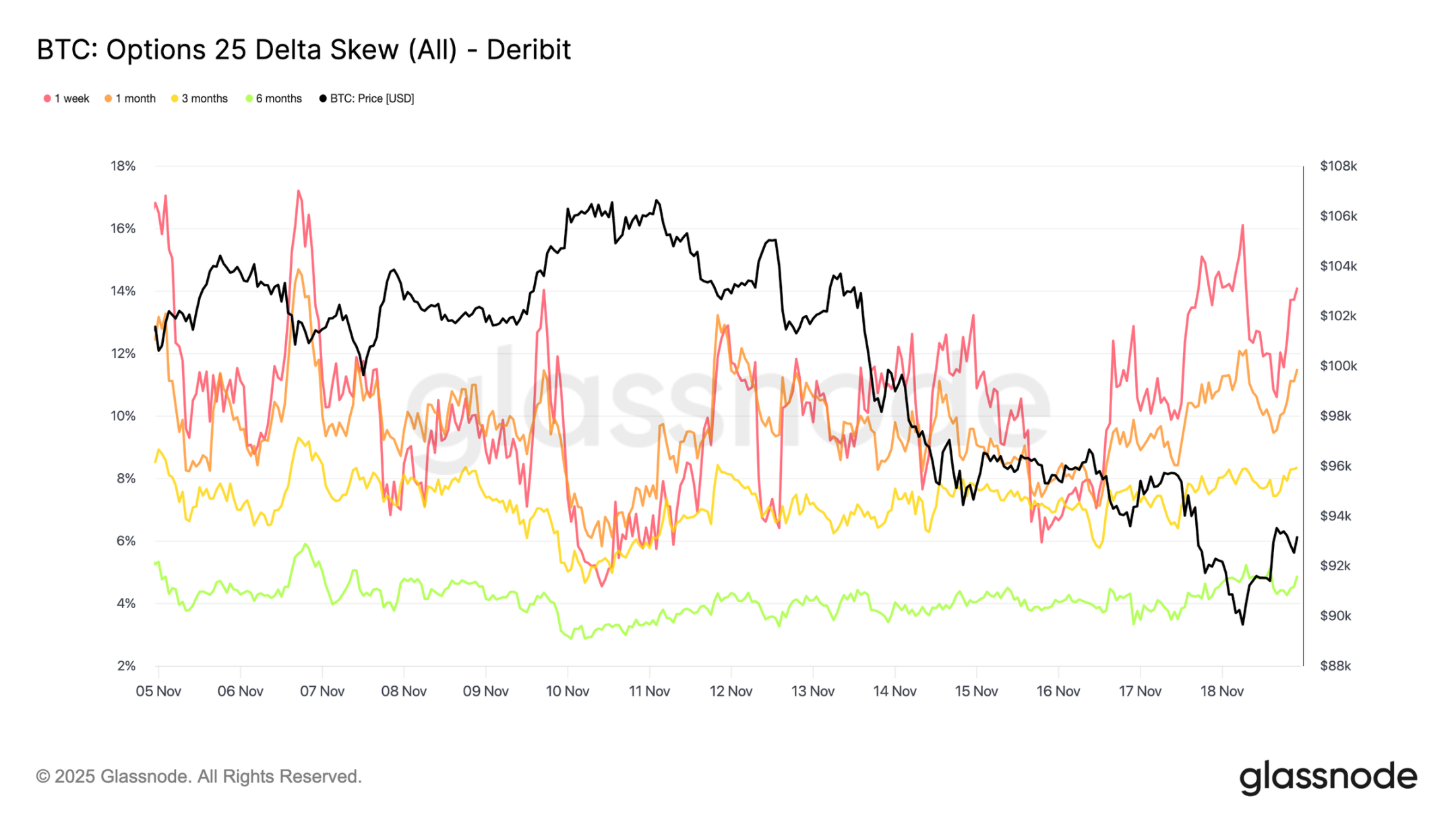 この動きは、スポット市場における売り圧力が強まるにつれて、トレーダーが下落リスク回避のためにより高い価格を支払う意思を示していることを示しています。この傾向は、以前から観測されている短期インプライド・ボラティリティの上昇とも整合しています。
