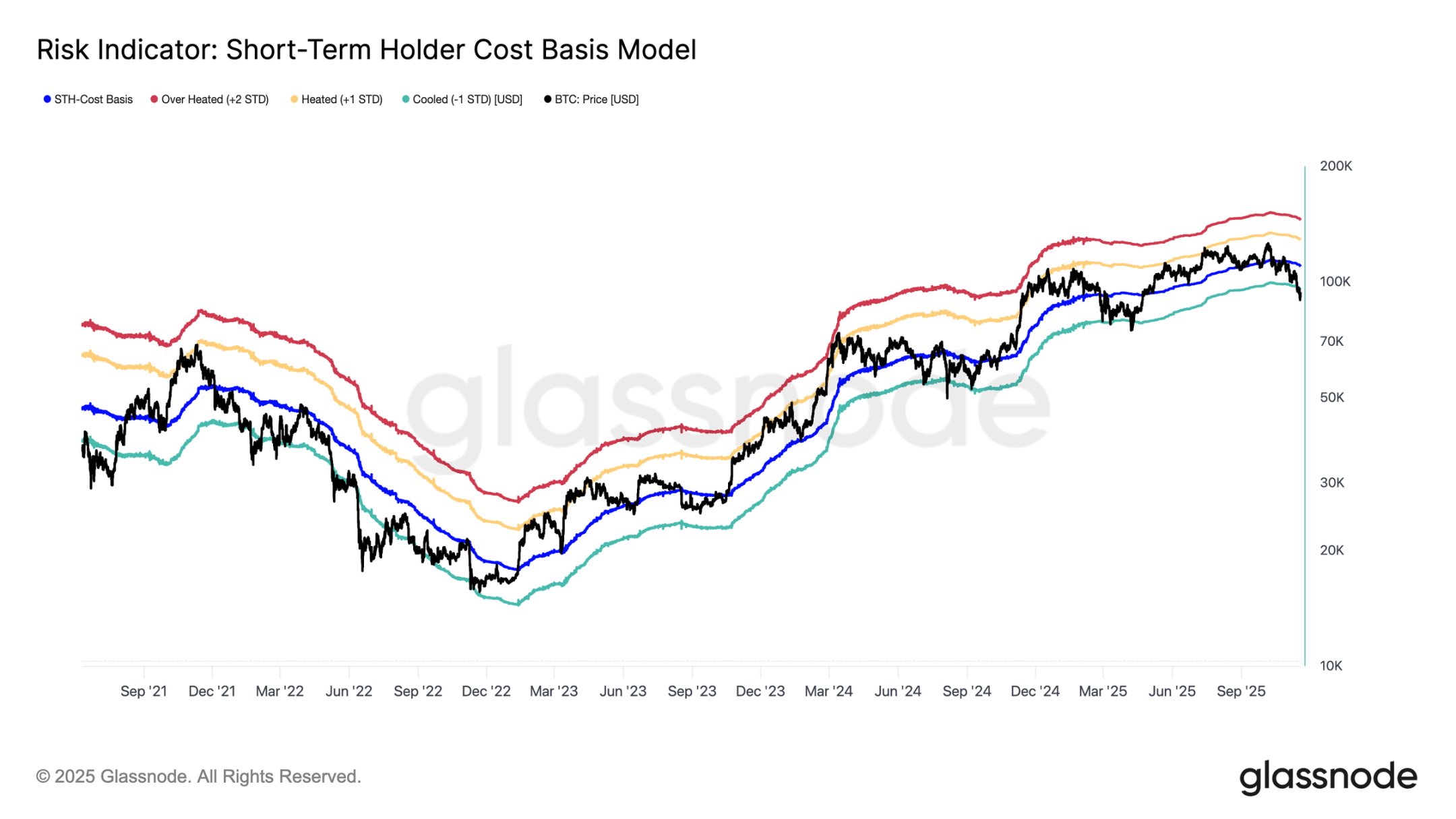 ビットコインは先週の「変動レンジ」の下限である9万7000ドルを下回り、さらなる調整のリスクを示唆しました。その後、価格は8万9000ドルまで急落し、短期保有者のコストベンチマーク(現在約10万9500ドル)を1標準偏差下回る9万5400ドルという新たなローカル安値を記録しました。